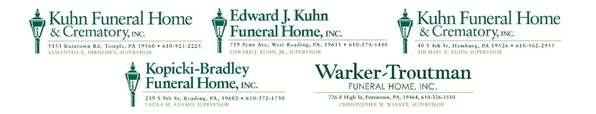 I consent to receive SMS notifications, alerts & occasional marketing communication from Kuhn Funeral Home. Message frequency varies. Message & data rates may apply. Text HELP to +1 610-557-1946 for assistance. You can reply STOP to unsubscribe at any time.